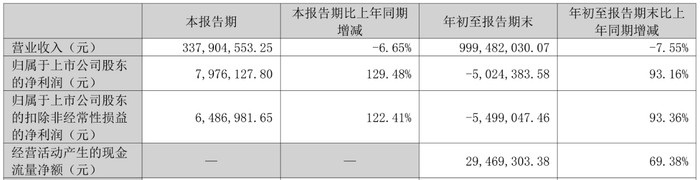 中国经济网北京12月14日讯宝明科技(002992.SZ)近日披露2025年第三季度报告。前三季度公司实现营业收入9.99亿元,同比下降7.55%;归属于上市公司股东的净利润为-502.44万元,上年同期为-7345.43万元;归属于上市公司股东的扣非净利润为-549.9万元,上年同期为-8277.20万元;经营活动产生的现金流量净额为2946.93万元,同比增长69.38%。